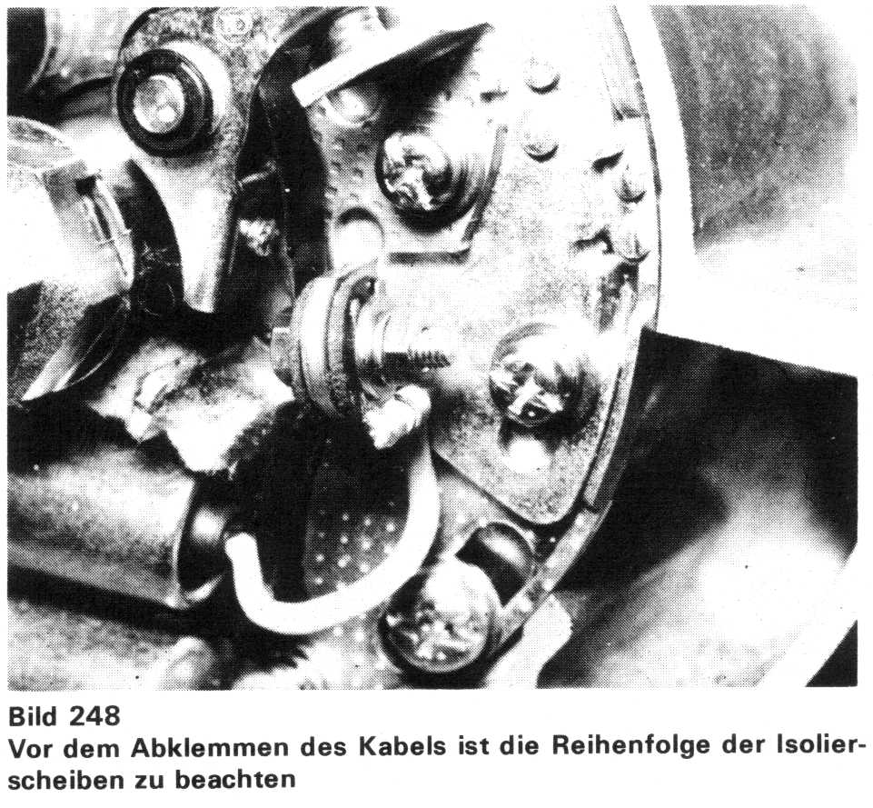 Zum Ausbau der Unterbrecherkontakte wird der Sicherungsring, der den beweglichen Kontakt an dem Stift, um den er sich dreht, hält, abgehoben. Die Mutter und die Schraube, mit der das biegsame Kabel am Ende der Kontakt-Rückholfeder befestigt ist, ab- und herausdrehen, wobei auf die Anordnung der Isolierscheiben zu achten ist, damit sie beim Zusammenbau wieder in ihrer ursprünglichen Anordnung aufgelegt werden können (Bild 248). Den beweglichen Kontakt von seinem Lagerstift abheben und von der Unterbrecherplatte abnehmen.  |