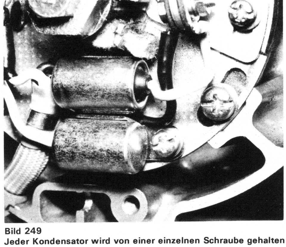 Die Kondensatoren sind auf der Trägerplatte des Unterbrecherkontakt-Satz parallel zueinander angebracht. Jeder Kondensator besitzt eine fest an ihm befestigte Halterung und ist mittels einer einzelnen Kreuzschlitzschraube an der Unterbrecher-Grundplatte befestigt (Bild 249), wodurch ein Abbauen leichtgemacht wird.  |