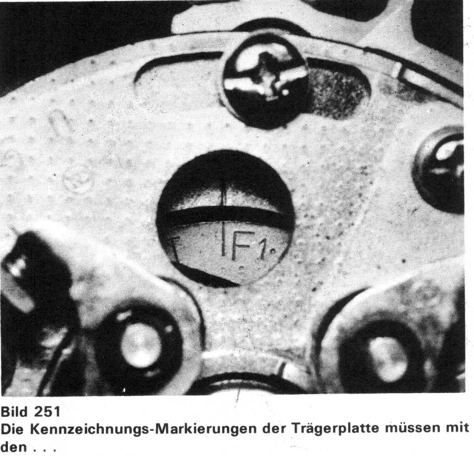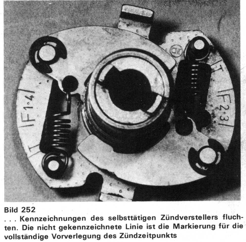 Einen Schraubenschlüssel an den Sechskant zum Durchdrehen des Motors ansetzen und den Motor unter gleichzeitiger Betrachtung des selbsttätigen Zündverstellers durch die Kontrollöffnung in der Unterbrecher-Grundplatte in Vorwärts-Laufrichtung drehen. Dabei lässt sich feststellen, dass auf jeder Seite des selbsttätigen Zündverstellers drei Strichmarkierungen angebracht sind (Bild 251 und Bild 252).