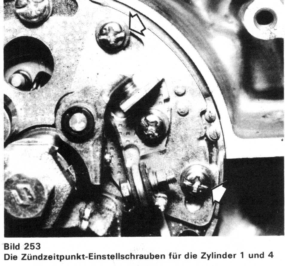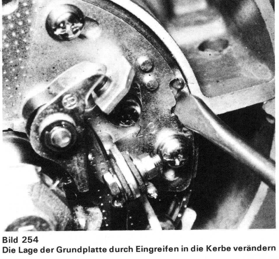 Zur Einstellung des Zündzeitpunktes der Zylinder 1 und 4 werden die drei durch die Langloch-Bohrungen am Rande der Grundplatte geführten Schrauben gelockert (Bild 253). Die Grundplatte drehen, bis die Glühlampe aufflackert und danach die Schrauben festziehen. Den Motor um 90° in Gegenlaufrichtung und danach wieder in die Vorwärts-Laufrichtung drehen, um die Einstellung zu kontrollieren. |