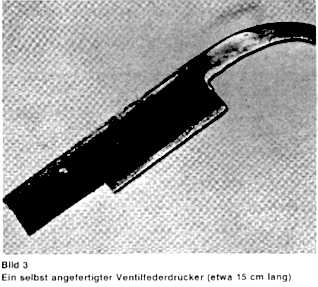 · Mit einer Fühlerlehre das Spiel des ersten Ventils messen und notieren. Liegt das Spiel außerhalb des Bereiches 0,03 bis 0,08 mm, dann muss die Einstellscheibe herausgenommen und durch eine andere in passender Dicke ersetzt werden. Zum Auswechseln der Scheiben gibt es ein Spezialwerkzeug von Suzuki (Nr. 09916‑64510), das neben dem Nocken zwischen Nockenwelle und Ventilstössel eingeführt wird. Falls dieses Spezialwerkzeug nicht verfügbar ist, kann man sich selbst einen Ersatz aus Eisenblech zurechtfeilen (Bild 3). Das Werkzeug ist etwa 15 cm lang. Das Originalwerkzeug von Suzuki kann in einem Zug eingeführt, hinuntergedrückt und gesichert werden, so dass der Ventilstössel hinuntergestoßen wird. Bei Verwendung des selbst angefertigten Werkzeuges muss der Stössel mit einem passenden Hebel, der zwischen der Einstellscheibe und dem Nocken eingeführt wird, hinuntergedrückt werden. Dann kann das Werkzeug eingesetzt werden, so dass der Stössel beim Austauschen der Einstellscheibe niedergedrückt bleibt. In jedem Fall muss vor dem Ansetzen eines Werkzeuges der Ventilstössel so gedreht werden, dass der Schlitz im erhöhten Rand nicht von der Nockenwelle verdeckt wird. Die Einstellscheiben können mit einem kleinen Schraubendreher herausgehebelt werden.