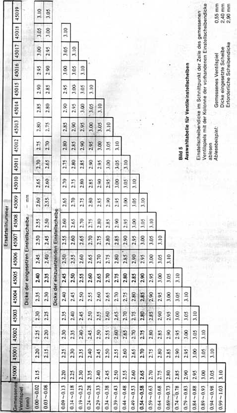 · Einstellscheiben sind in 20 verschiedenen Dicken zwischen 2,15 und 3,10 mm in Stufen von 0,05 mm erhältlich. Jede Scheibe ist an der Rückseite mit einer dreistelligen Zahl bezeichnet, welche die Dicke in 1/100 mm angibt, z.B. 235 für 2,35 mm. Die Scheiben werden nach der Tabelle in Bild 5 ausgewählt.