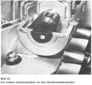 · Nach dem Einstellen sämtlicher Ventile den Ventilkammerdeckel montieren; dabei die halbkreisförmigen Dichtungen an jedem Ende der Nockenwellenkammern nicht vergessen. Zuletzt die Verschlussstopfen montieren (Bild 55)