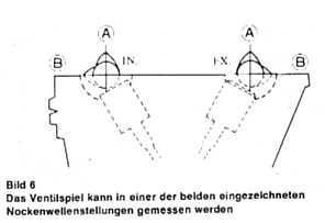 · Das Spiel zwischen jedem Nocken und dem entsprechenden Ventilstössel muss geprüft und nötigenfalls durch Austauschen der Einstellscheibe eingestellt werden. Die Messung und Einstellung für ein Ventil ausführen, erst dann zum nächsten Ventil übergehen. Dazu muss sich die Nockenwelle in einer der beiden in Bild 6 angegebenen Stellungen befinden. Der Motor wird am grossen 19-mm Sechskant unter der Schraube des Unterbrechernockens durchgedreht.